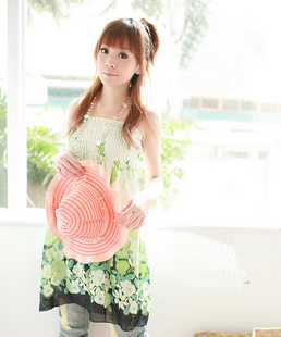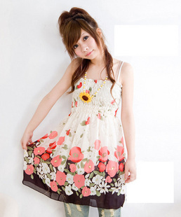 梦幻波浪玫瑰花朵雪纺吊带连衣裙